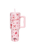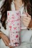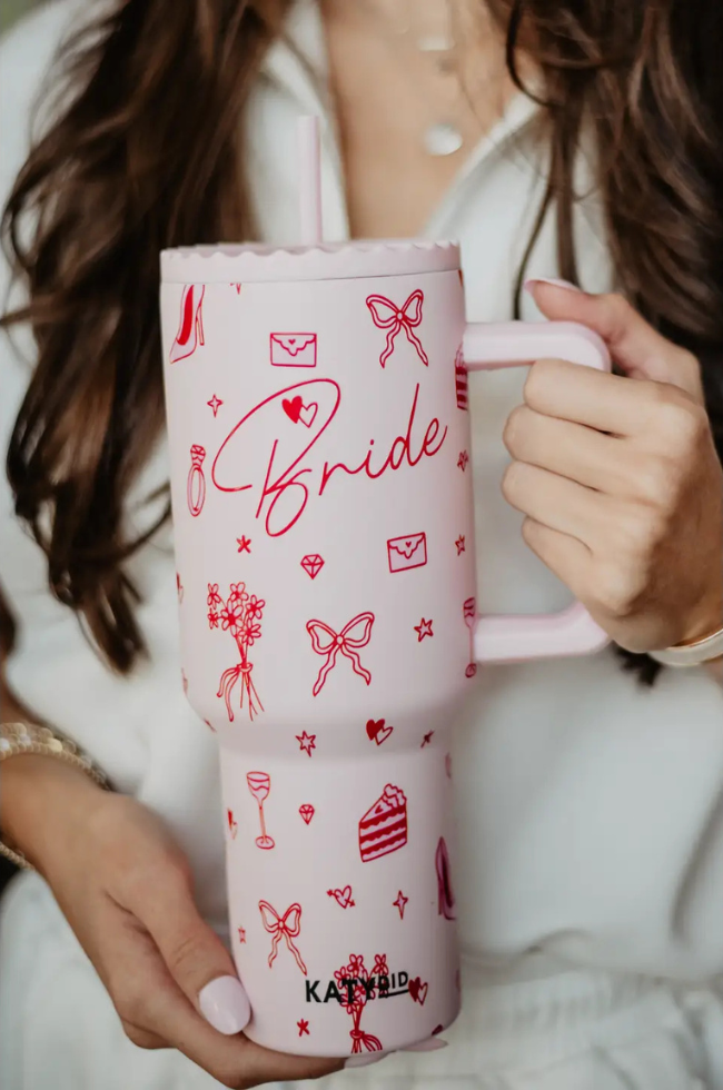This large handle tumbler has “Bridal Era” written all over it with its soft pink background featuring wedding doodles and “Bride" in red script. This 38oz wine cup features double layer insulation to keep drinks hot or cold and a reusable plastic straw. Hand wash only.