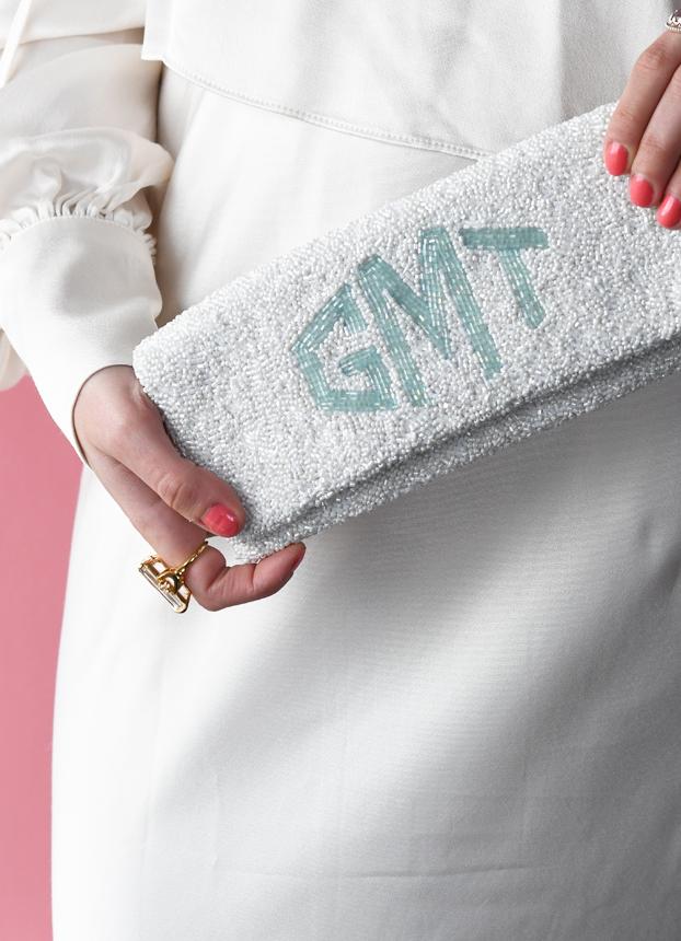 A white beaded clutch with lettering in your choice of color and font. Add your personalization to the outside, inside or both! This clutch is entirely hand-beaded & made to order.