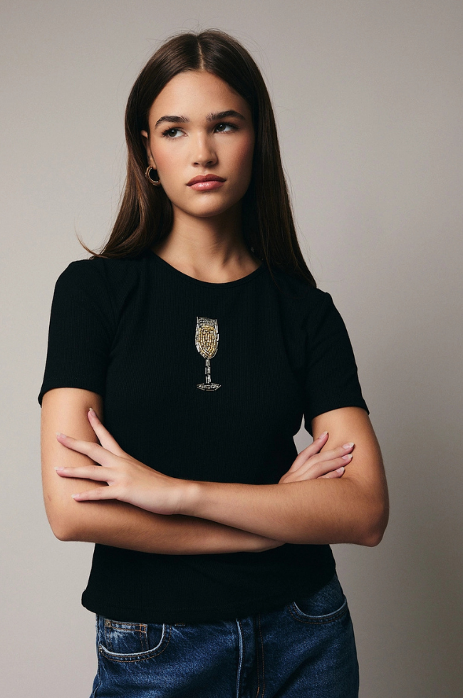 This playful top features soft, stretchy ribbed knit fabric and a sparkling beaded champagne glass detail.