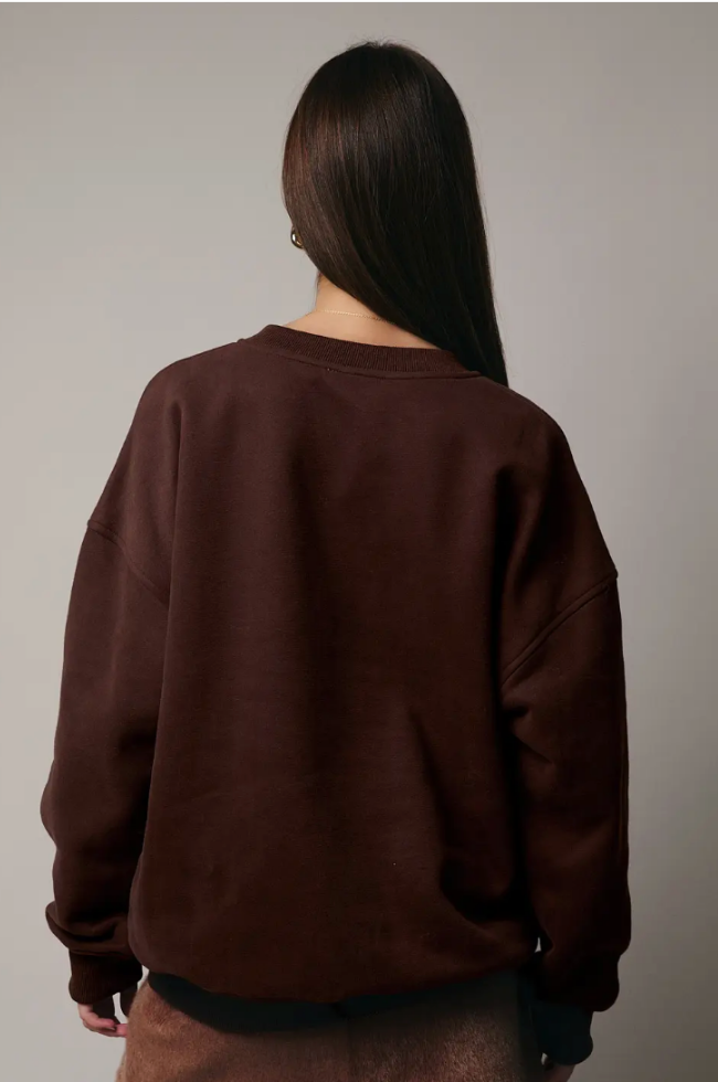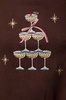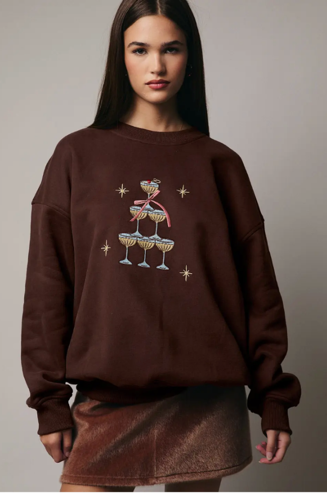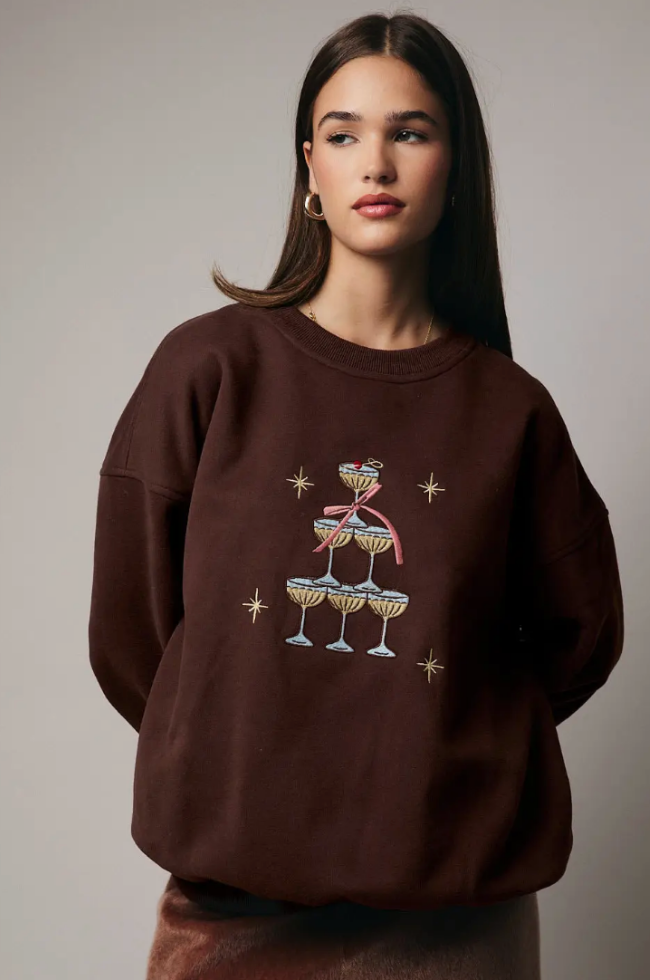 A cozy and festive crewneck sweatshirt with an embroidered champagne tower on the front.