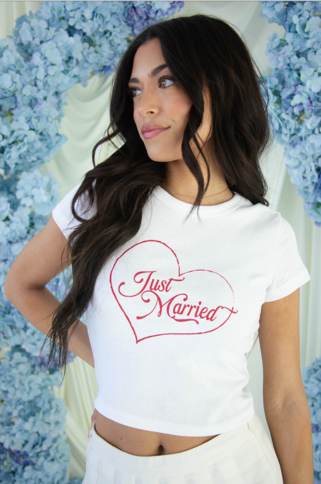 Wear your heart on your chest with the perfect cropped addition to your bridal wardrobe. This white baby tee features a fitted silhouette with short cap sleeves and a trendy cropped hem, showcasing a hand-drawn heart and "Just Married" script in a rich cherry red. It’s the ultimate cool-girl piece for your honeymoon and post-wedding festivities.