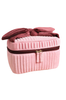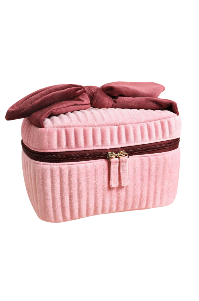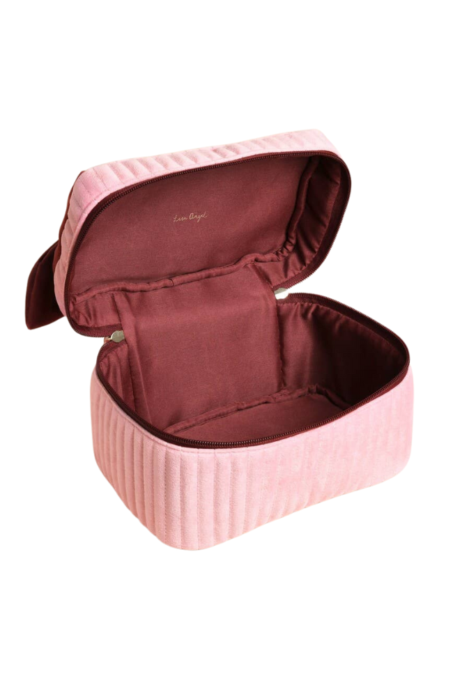 A pale pink and red velvet bow vanity makeup bag. Designed in Norwich, UK.