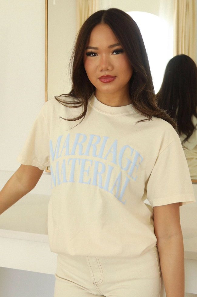 A little something blue for the bride to be. This ivory Comfort Colors tee features a pretty, soft blue "Marriage Material" across the chest and is the perfect tee for all the bride's pre-wedding events!