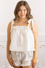 This set features a Tie Top Tank & Drawstring Waist Shorts. 100% Woven Cotton. Machine Wash Cold on the Gentle Cycle, Dry Low. Do Not Iron or Dry Clean. Designed in the USA.